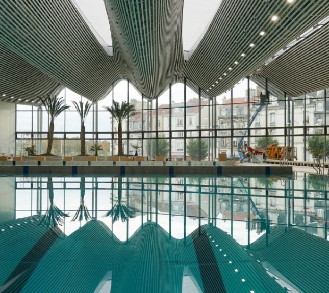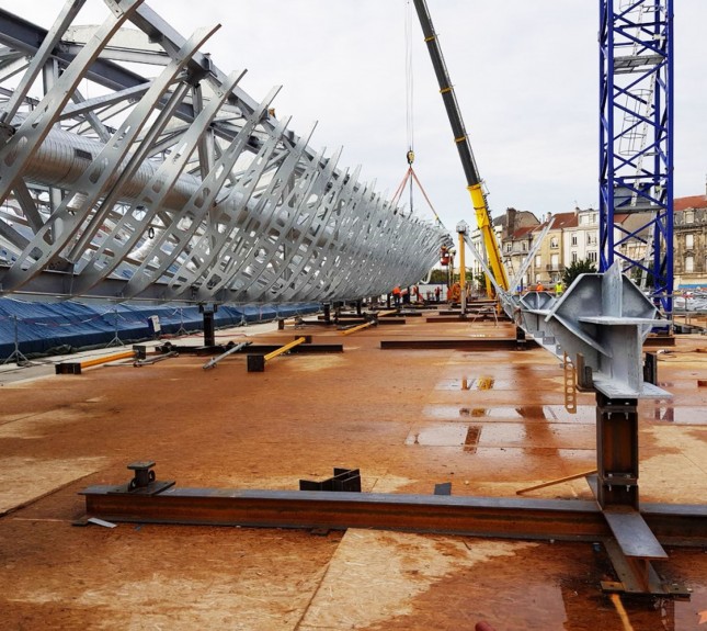 Concept Design, progetto esecutivo, progetto costruttivo di officina per strutture metalliche provvisionali di supporto e di montaggio delle carpenterie metalliche principali del nuovo centro Acqualudico di Reims.